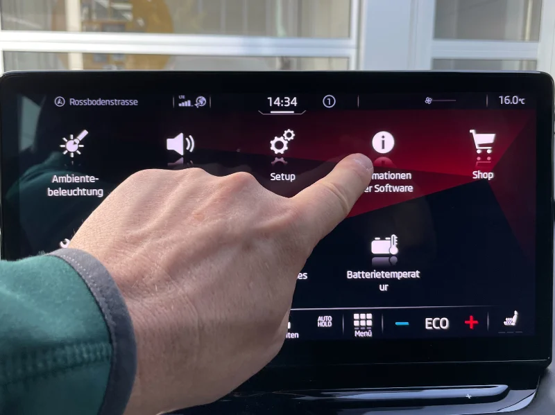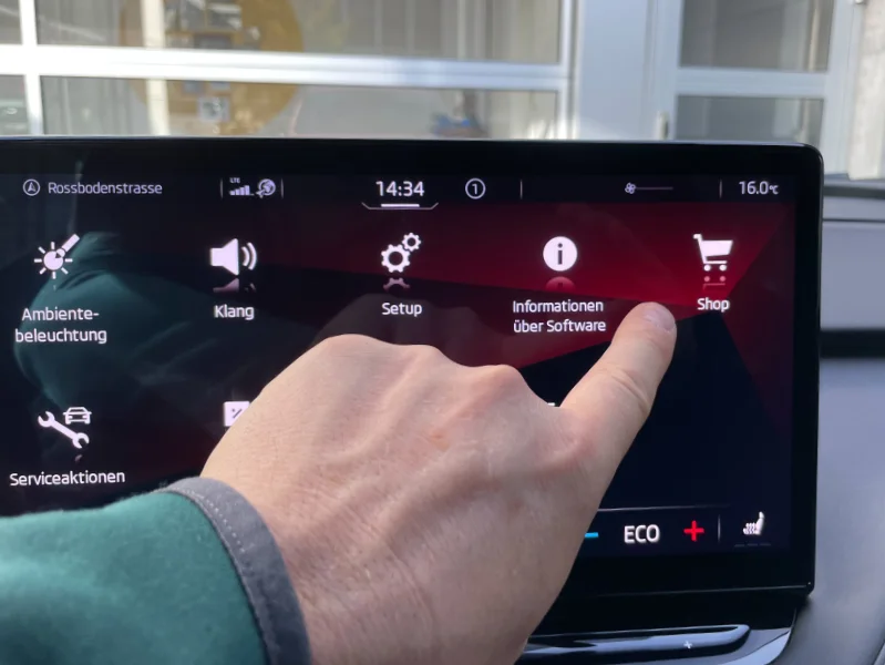Im Fahrzeugmenü unter „Informationen über die Software“ findest du die aktuelle Versionsnummer.