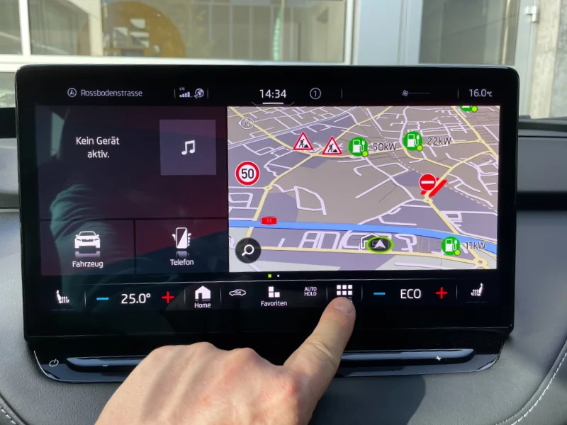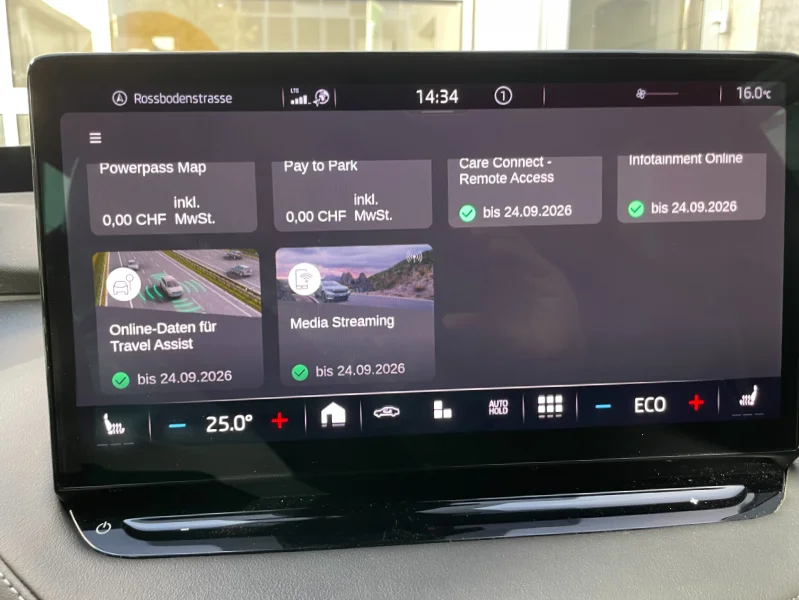 - Škoda Care Connect – SOS-Notruf, Fahrzeugfernzugriff (z. B. Klima, Ladezustand).