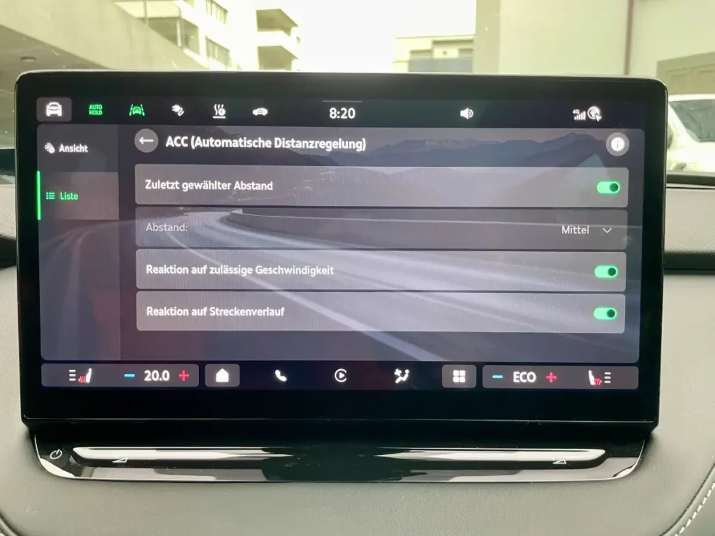 Mit einer Ausnahme: Ist der prediktive Abstandtempomat (pACC) oder der Travel Assist aktiv und ist die Option „Reaktion auf zulässige Geschwindigkeit“ aktiv, wird Dein Škoda Elektroauto die neue Geschwindigkeit nicht nur anzeigen, sondern als Fahrgeschwindigkeit übernehmen. Entsprechend wird gebremst oder beschleunigt.